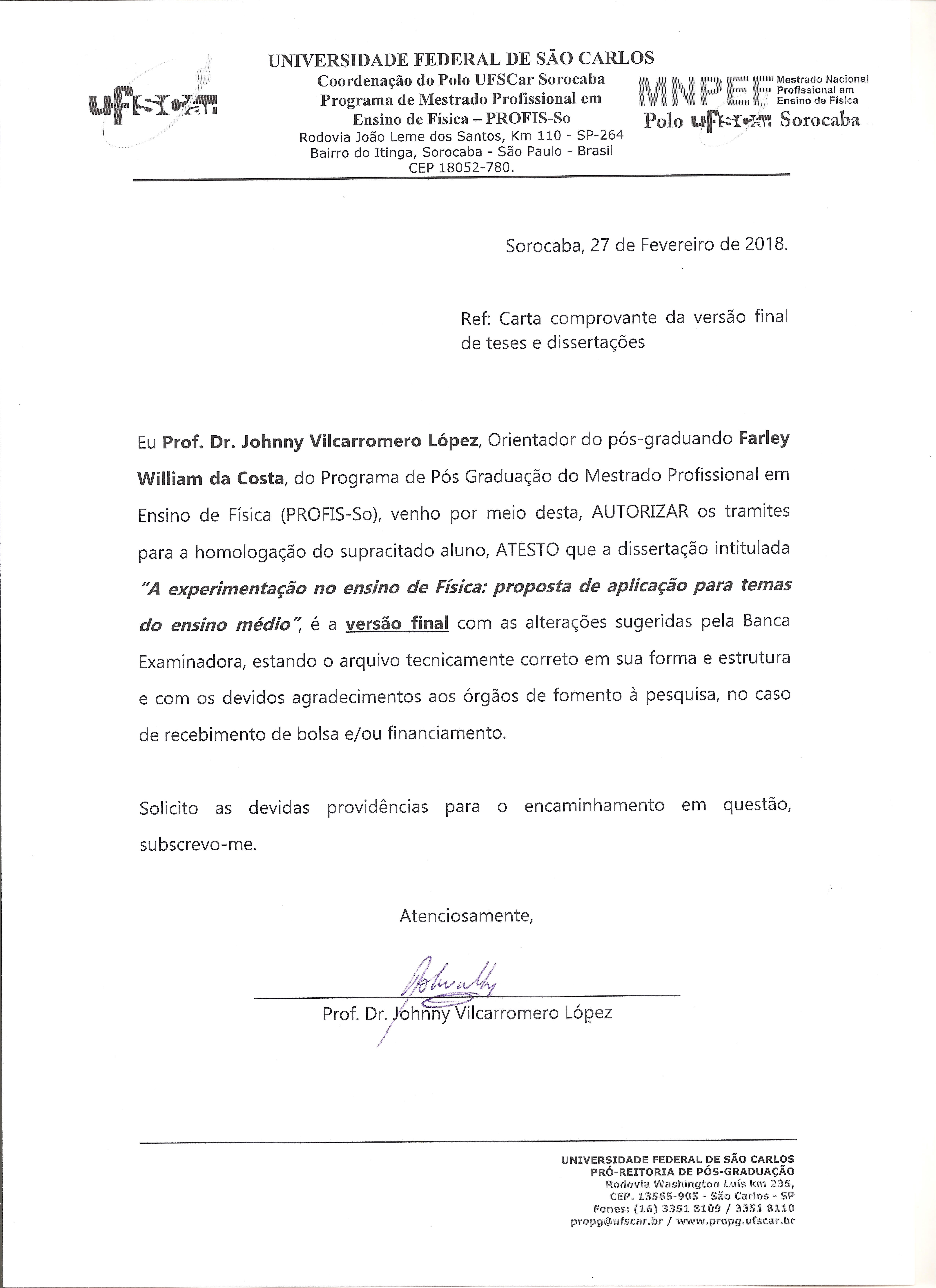 COSTA, Farley William da. A experimentação no ensino de Física: proposta de aplicação para temas do ensino médio. 2017. Dissertação (Mestrado em Ensino de Física) – Universidade Federal de São Carlos, Sorocaba, 2017. Disponível em: https://repositorio.ufscar.br/handle/20.500.14289/9528.