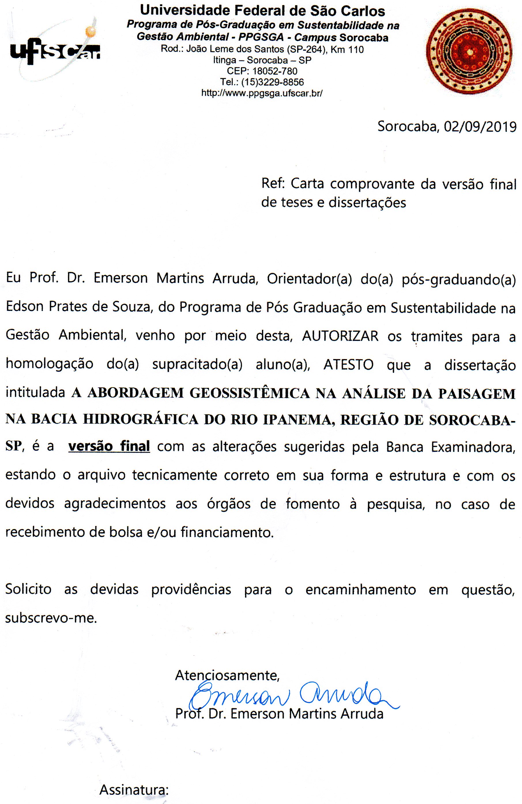 SOUZA, Edson Prates de. A abordagem geossistêmcia na análise da paisagem na bacia hidrográfica do Rio Ipanema, região de Sorocaba-SP. 2017. Dissertação (Mestrado em Sustentabilidade na Gestão Ambiental) – Universidade Federal de São Carlos, Sorocaba, 2017. Disponível em: https://repositorio.ufscar.br/handle/20.500.14289/12333.