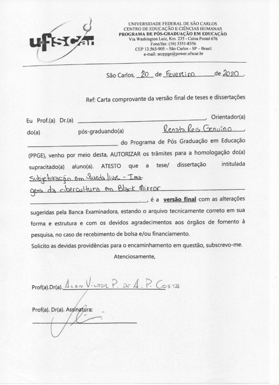 GENUÍNO, Renata Reis. Subjetivação em Queda Livre: imagens da cibercultura em Black Mirror. 2020. Dissertação (Mestrado em Educação) – Universidade Federal de São Carlos, São Carlos, 2020. Disponível em: https://repositorio.ufscar.br/handle/20.500.14289/13152.