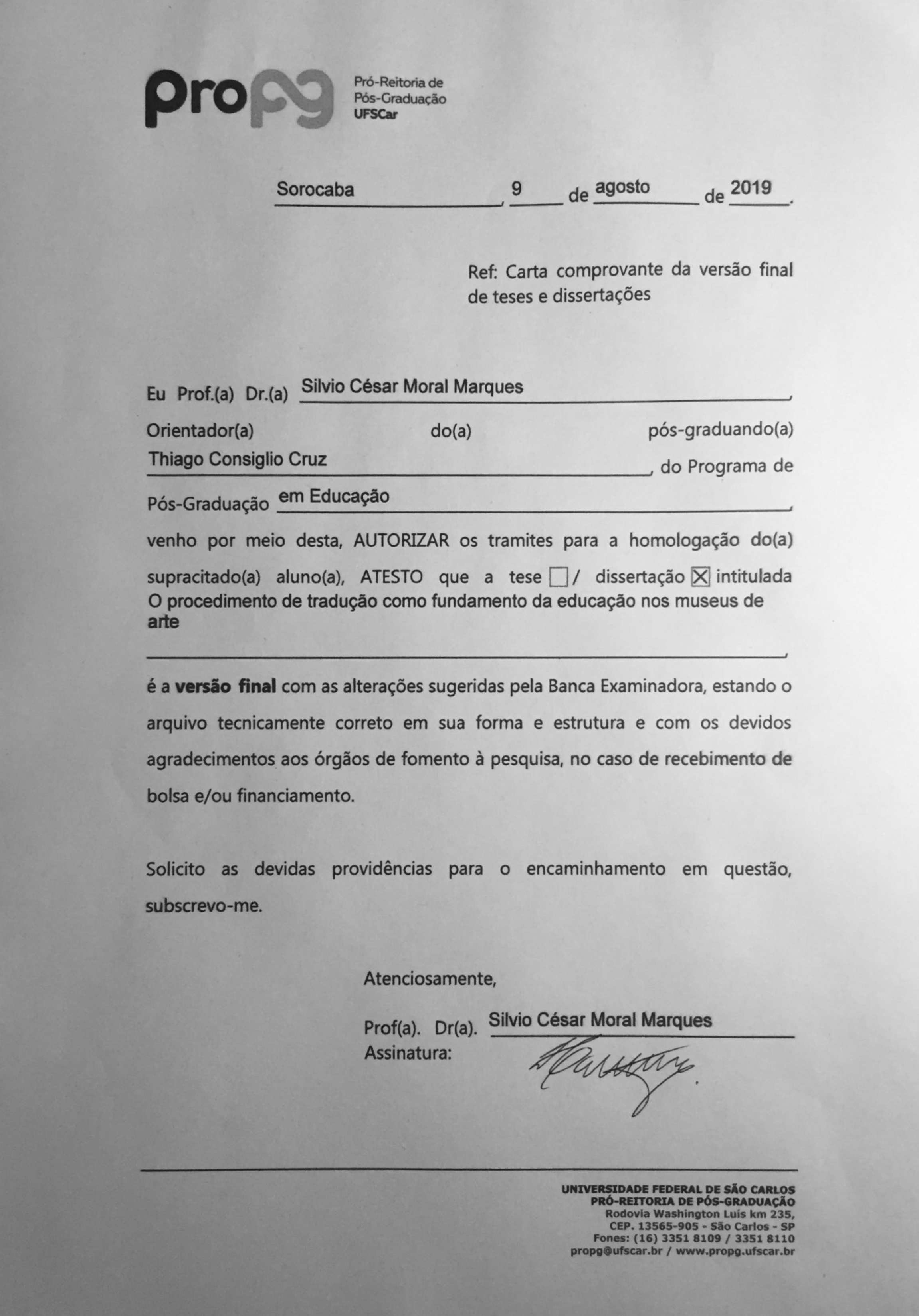 CONSIGLIO, Thiago. O procedimento de tradução como fundamento da educação nos museus de arte. 2019. Dissertação (Mestrado em Educação) – Universidade Federal de São Carlos, Sorocaba, 2019. Disponível em: https://repositorio.ufscar.br/handle/20.500.14289/11707.
